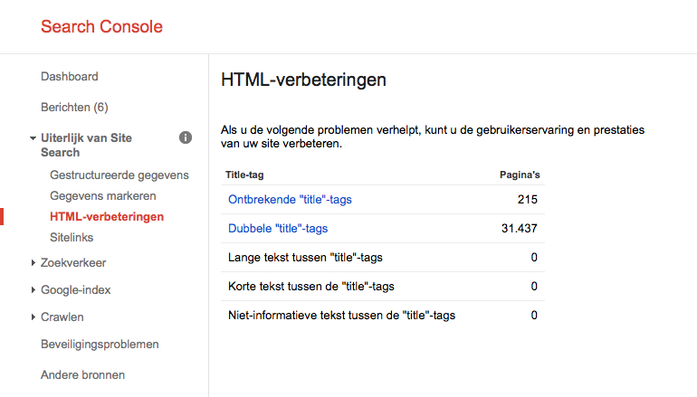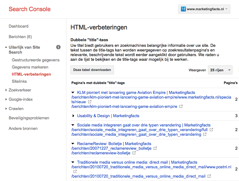 Dat er onbedoeld meerdere url’s zijn waarop je content aanwezig is, is iets waar ik bij Marketingfacts zelf tegenaan ben gelopen. Bij het analyseren van het hoge aantal geïndexeerde pagina’s stuitte ik al snel op een groot aantal pagina’s met dezelfde titel.