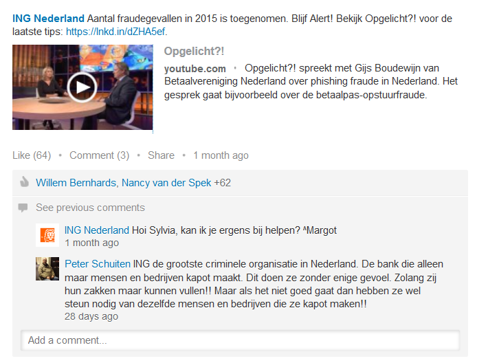 Is het met opzet dat er onder dat “goede” voorbeeld van ING een tirade zichtbaar is van iemand die helemaal geen ING-fan lijkt? Merkwaardig.