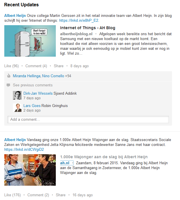 Naast dat het goed is om ook inhoudelijk met je updates te variëren, is het ook slim om naar de vorm te kijken. Zo zien we bij veel bedrijven alleen maar zogenoemde link updates terug. Dit zijn updates met een kleine afbeelding, meer tekst en vier doorverwijzende links, zie het voorbeeld van Albert Heijn.