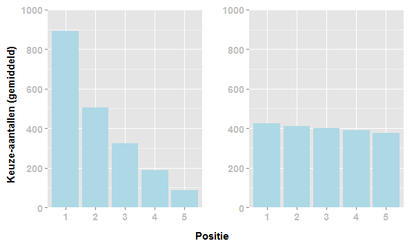 Het verschil tussen de simulaties mét (links) en zónder (rechts) preferential attachment is duidelijk waarneembaar. In de linkse figuur is te zien dat blogposts die op plaats 1 eindigden aanzienlijk meer lezers binnenhaalden dan die bijvoorbeeld eindigden op plaatsen 3 tot en met 5. Gemiddeld over de 100 simulaties haalden de posts op plaats 1 rond de 900 lezers binnen (bijna de helft van alle 2000 lezers!), terwijl die op plaats 3 slechts op zo’n 300 lezers uitkwamen. Bij de simulaties zónder preferential attachment (rechts) daarentegen zijn de verschillen tussen plaatsen 1 tot en met 5 opvallend kleiner.