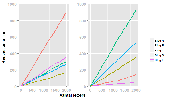 Deze computersimulatie kun je blijven herhalen en iedere keer zul je zien dat de vijf posts op het einde niet dezelfde aantallen lezers halen. Het linkse figuur hieronder vat de resultaten samen van 100 afzonderlijke simulaties.