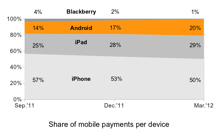 Op dit moment heeft 42% van de Nederlanders een smartphone en in maart 2012 werd 6,2% van de aankopen via een mobiel apparaat gedaan. Dit bleek uit onderzoek dat we binnen onze database van ruim 1500 online winkeliers hebben uitgevoerd. Ook zien we een verschuiving van iPhone- naar Android-toestellen: in september 2011 was de verdeling nog respectievelijk 57% en 14%, in maart 2012 is dit verschoven naar 50% iPhone en 20% Android. Mobiele aankopen vanaf de iPad nemen ook iets toe ten koste van de iPhone van 25% in september tot 29% in maart.
