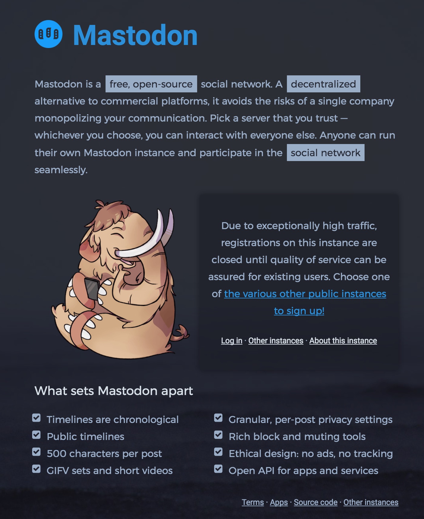 Mastodon opereert zelfstandig en wordt dus niet beheerd door een ander groot sociaal netwerk, zoals Instagram. Dit betekent dat het platform op eigen servers draait. Dat heeft voordelen, maar ook nadelen: vanwege alle media-aandacht van de laatste tijd en de bijbehorende overbelasting van de servers, is de mogelijkheid voor het aanmaken van nieuwe accounts tijdelijk ‘bevroren’.