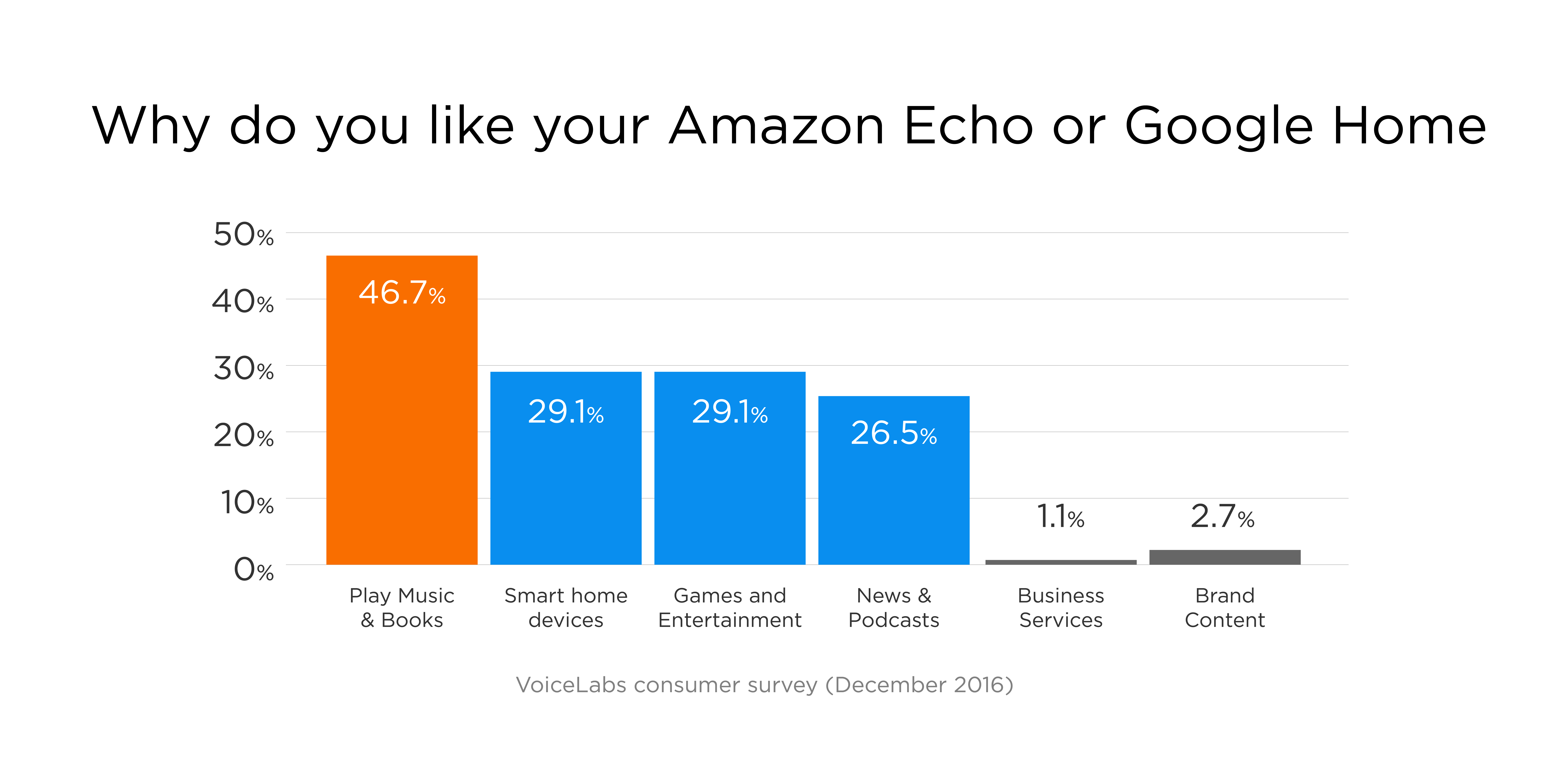 Laten we allereerst eens kijken hoe gebruikers Alexa op dit moment benutten. Onderzoek van Voicelab laat zien dat bijna de helft van de mensen met een voice-first–device het apparaat gebruikt om muziek en audioboeken af te spelen. Ongeveer een derde van de gebruikers laat de apparaten smart home gadgets aansturen of games en entertainment activeren. Daarnaast laat één op de vier gebruikers Alexa (of Google Home) het laatste nieuws voorlezen en podcasts afspelen.