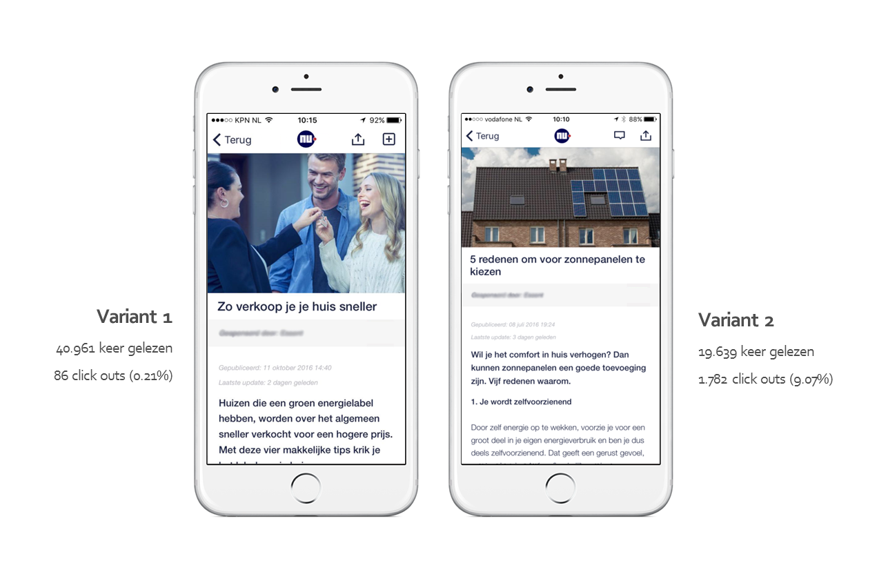 Het zit hem namelijk in nuances. Details. Niet alleen of de content kwalitatief hoogwaardig is en ‘blend’ met de overige content, maar spreekt de kop ook aan? Pakt het beeld? Is de invalshoek verrassend en toegespitst op de doelstelling (zie voorbeeld hieronder: brede awareness versus conversie naar adviesgesprek)? Maar bovenal weet je de verwachtingen van de doelgroep op de juiste manier te managen? Of voelt hij zich in het ootje genomen? Naast de ‘messaging’ is de context als tijd, locatie, platform, besturingssysteem, positie binnen het platform, et cetera. belangrijk om het verhaal zo goed mogelijk op af te stemmen. Waar bevindt de doelgroep zich op het platform? Wat is zijn/haar navigatiepad? Op welk moment is de doelgroep ontvankelijk voor mijn verhaal? Hoeveel tijd heeft hij/zij?