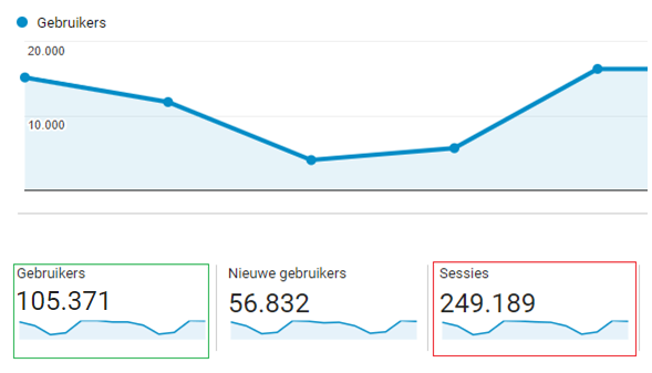 Ga binnen Analytics naar Doelgroep > Overzicht. Daar zie je direct het aantal sessies en gebruikers van de geselecteerde periode. In het geval van het voorbeeld zijn het 105.371 gebruikers met 249.189 sessies.