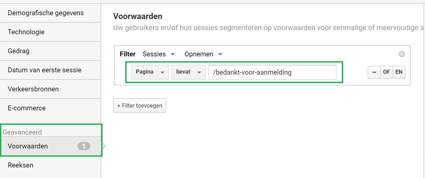 Klik bovenaan op ‘Segment’ en creëer een segment met daarin het doel dat je wil doormeten. Wanneer dit een bepaalde ‘bedankt’-pagina is, kun je dit vrij simpel te doen door ‘Voorwaarden’ aan te klikken binnen het nieuwe segment. Daar zet je een deel van de URL in.