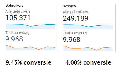 @Gerard, ik heb nog een aanvulling op hetgeen wat je denk ik bedoeld. Het maakt niet uit of je op sessie of op gebruiker niveau segmenteert, we pakken de gebruikers en de aantal Trial geconverteerde. Bij “gebruiker conversies” is er maar 1 conversie per user.