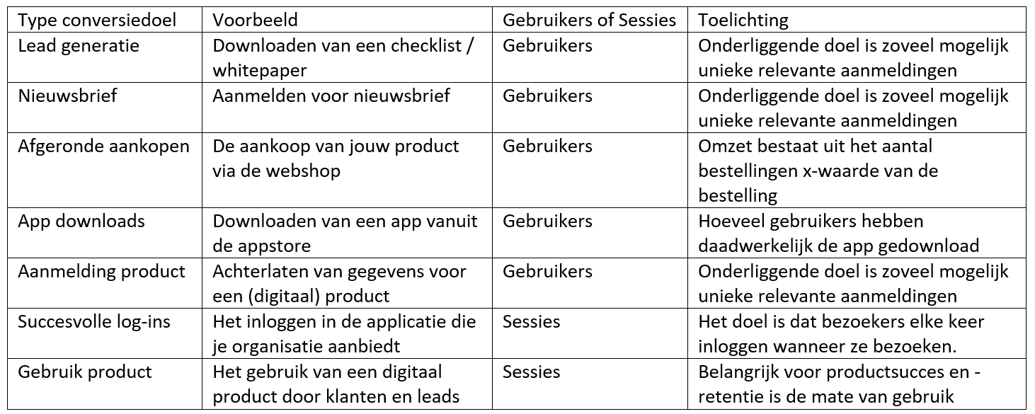 Handig: een tabel met het type conversiedoel en suggestie qua meetfactor (sessie of gebruiker):