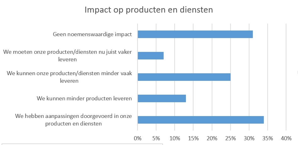 Slechts 31 procent van de respondenten geeft aan dat het coronavirus (nog) geen noemenswaardige impact heeft op het product of dienst. Ruim eenderde heeft aanpassingen doorgevoerd in producten, denk hierbij aan het – waar mogelijk – online aanbieden van de diensten (consultancy, opleidingen). Ook geeft ruim een kwart aan dat ze de producten of diensten minder vaak kunnen leveren. Een klein deel (7 procent) merkt juist nu een toegenomen vraag naar hun producten/diensten.