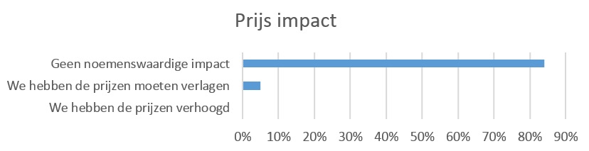 Onderdeel in de marketingmix met de grootste impact op de korte termijn is het aanpassen van de prijsstructuur. Hier zijn de marketeers eensgezind; deze blijven bij bijna 85 procent van de organisaties waar zij werkzaam zijn nog ongewijzigd. Zo’n 5 procent heeft al prijzen moeten verlagen, denk hierbij aan beperkt houdbare producten zoals verswaren en sierteelt. In een aantal gevallen werd ook nadrukkelijk gemeld dat de impact pas einde van het jaar echt goed zichtbaar is.