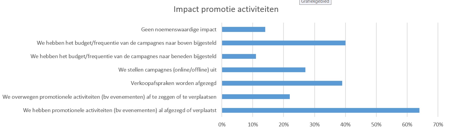 Bij tijdelijke en aanhoudende laagconjunctuur wordt snel geneden in kosten voor advertising en promotie omdat de kosten vrijwel direct wegvallen en de aanhoudende consequenties vaak pas over een langere periode zichtbaar worden. Uit de steekproef blijkt dan ook dat het coronavirus hier de meeste impact heeft: promotionele activiteiten worden massaal afgezegd of verplaatst en verkoopafspraken gaan niet door. Ruim een kwart van de ondervraagden stelt campagnes uit en nog eens 10 procent heeft het budget al naar beneden bijgesteld.