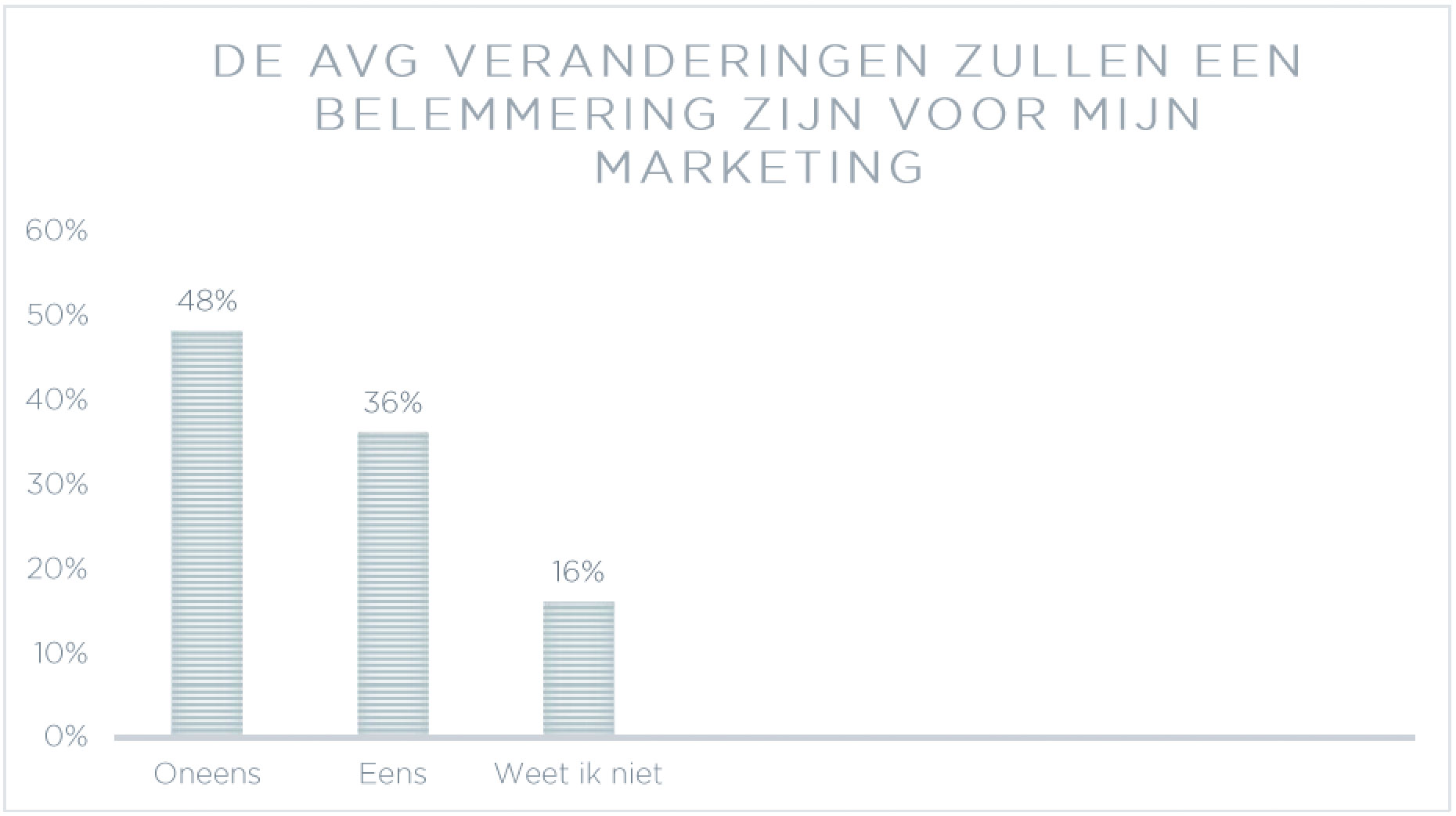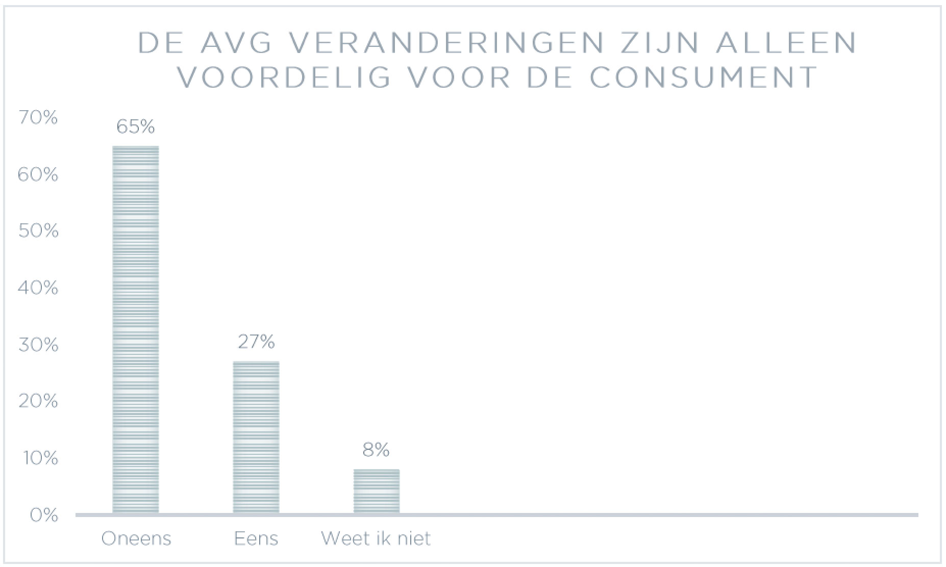 Tegelijkertijd verwachten de meeste organisaties zelf ook baat te hebben bij de wet. Tweederde is het niet eens met de stelling dat de AVG alleen voor consumenten voordelig is. De helft ziet de wet ook niet als belemmering voor marketingactiviteiten, eenderde is daar wel bang voor.