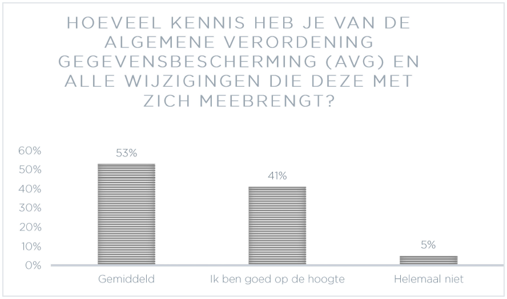 41 procent van de respondenten geeft daarbij aan zelf goed op de hoogte te zijn van de nieuwe regels, 53 procent is gemiddeld geïnformeerd en 5 procent helemaal niet. Een gebrek aan capaciteit (33 procent), tijd (25 procent) en kennis (10 procent) worden als belangrijkste oorzaken genoemd. Voor 15 procent heeft de AVG-voorbereiding geen prioriteit.