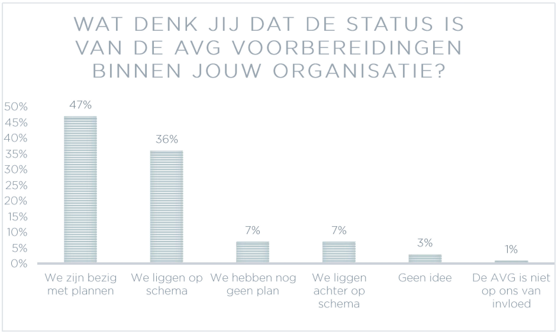 De resultaten laten weinig te raden over: de meeste Nederlandse bedrijven voldoen nog lang niet aan de AVG. Slechts 36 procent van de ondervraagde marketeers geeft aan dat zijn of haar organisatie op schema ligt met de voorbereidingen. Iets minder dan de helft van de bedrijven maakt plannen en de rest heeft nog helemaal geen voorbereidingen getroffen.