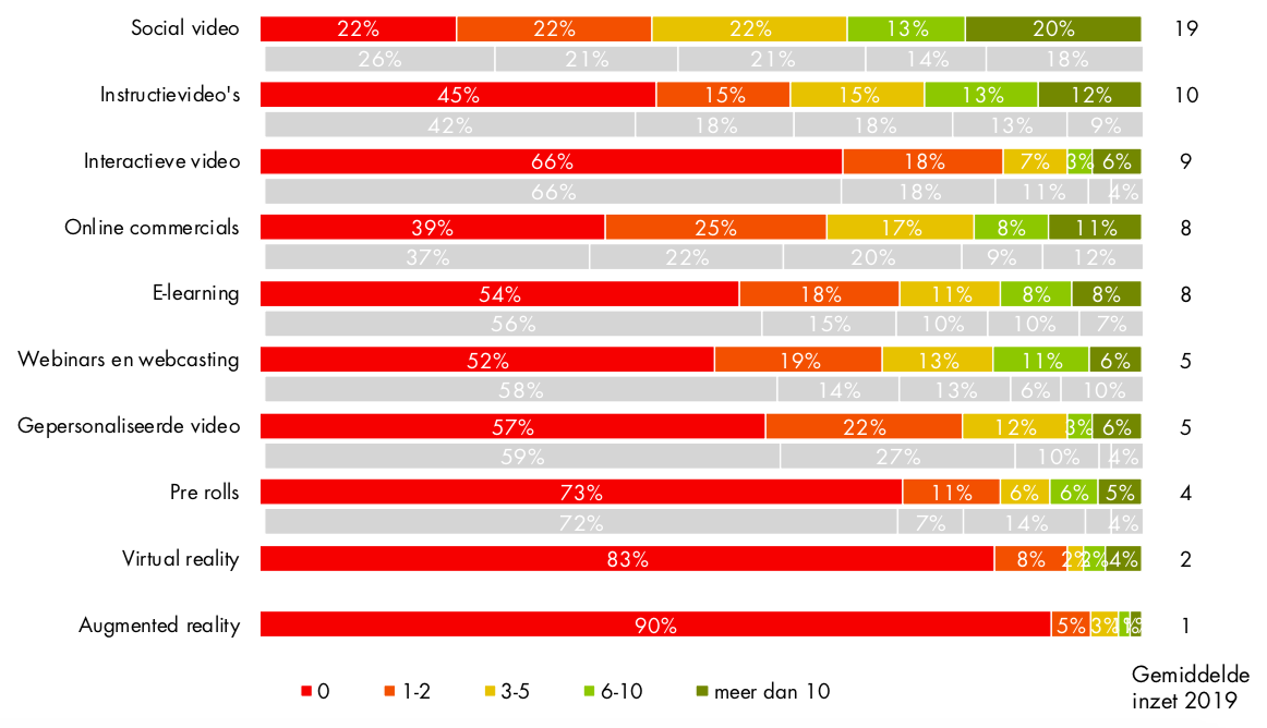 Door de jaren heen is er wel een verschuiving te zien in het soort video’s dat wordt ingezet binnen marketingafdelingen. Social video is de populairste vorm: 78 procent van de respondenten heeft dit de afgelopen twee jaar ingezet. De enige vormen van video die aan populariteit moeten inboeten, zijn online commercials (ingezet door 61 procent) en pre-rolls (27%). Virtual Reality en Augmented Reality is nog niet mainstream geworden: respectievelijk 17 procent en 10 procent heeft deze vormen van video al eens ingezet.