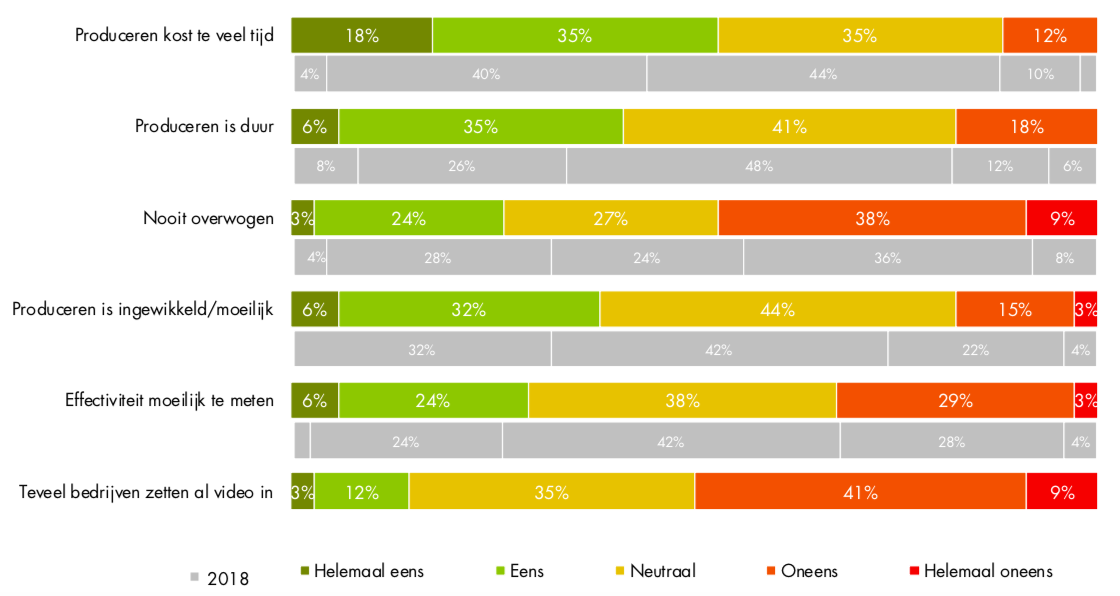 Het meest gehoorde bezwaar bij de inzet van online video is dat de productie te veel tijd kost. Maar liefst 53 procent van de respondenten die geen video inzet, ziet de benodigde tijd als belemmering, wat een flinke stijging is ten opzichte van 2018 (toen dit percentage nog 44 procent was). Voor nog eens 41 procent zijn de kosten een drempel om video’s te produceren, 38 procent vindt video te ingewikkeld.