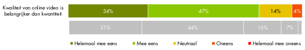 Het tijdgebrek zorgt er overigens niet voor dat marketeers van plan zijn om video links te laten liggen. Op de stelling ‘Te veel bedrijven zetten al video in’ antwoordt slechts 15 procent positief. Wel vinden de respondenten kwaliteit nog altijd veel belangrijker dan kwantiteit: