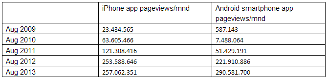 Zij zagen Android pas eind 2011 echt hard gaan. Kijken we naar pageviews in de apps, dan is Android bij hen ergens rond oud & nieuw 2012/2013 iOS voorbijgegaan.