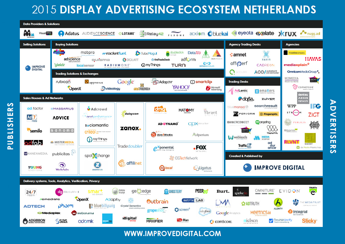 Om met marketing automation aan de slag te gaan, is het noodzakelijk om het advertentielandschap te begrijpen. Het landschap van media-inkoop en -verkoop is namelijk complex, alleen al als je naar online adverteren kijkt. Improve Digital heeft dit landschap voor 2015 in Nederland als volgt geïllustreerd: