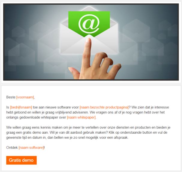 Op dat moment gaat de trigger af om een demoaanvraag onder de aandacht te brengen. Deze e-mail wordt een dag later verstuurd naar de bewuste bezoeker A. De e-mail is gepersonaliseerd met bedrijfsnaam, bekeken producten en de gedownloade whitepaper. Daarnaast wordt er een dynamische header getoond die afhankelijk is van de interesses, bijvoorbeeld op product-interesseniveau. In dit geval is de interesse ‘e-mailmarketingsoftware’. Door deze gepersonaliseerde content ben je relevant en ga je direct de dialoog aan met bezoeker A.