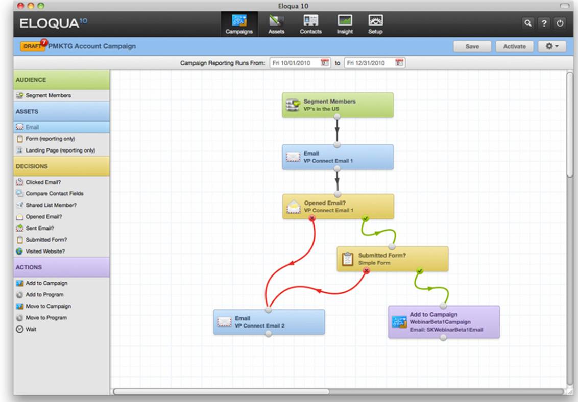 Bij marketing automation kan je van tevoren hele nurturing-campagnes klaar zetten door middel van een drag and drop-systeem. Het is mogelijk verschillende regels in te stellen, zodat de juiste leads automatisch in de juiste campagne terechtkomen. Door een trigger, zoals bijvoorbeeld meer dan 5 minuten op een productpagina besteden, komt een lead met opt-in automatisch in een bepaalde campagne terecht.