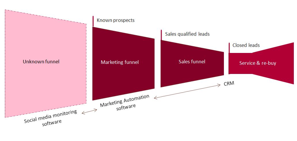CRM-systemen zijn minder goed in het vastleggen en managen van alle marketingactiviteiten via de verschillende kanalen. Marketing automation is bedoeld om juist het eerste deel van de salesfunnel te ondersteunen: het klaarstomen van leads voor sales. Daarom is marketing automation-software uitgerust met functionaliteiten als lead scoring, multi-touch campagne tools, het tracken van gedrag en het opzetten van 360 graden klantprofielen. Voor het beste resultaat integreer je marketing automation met een CRM systeem.