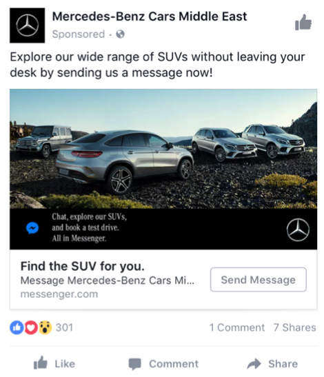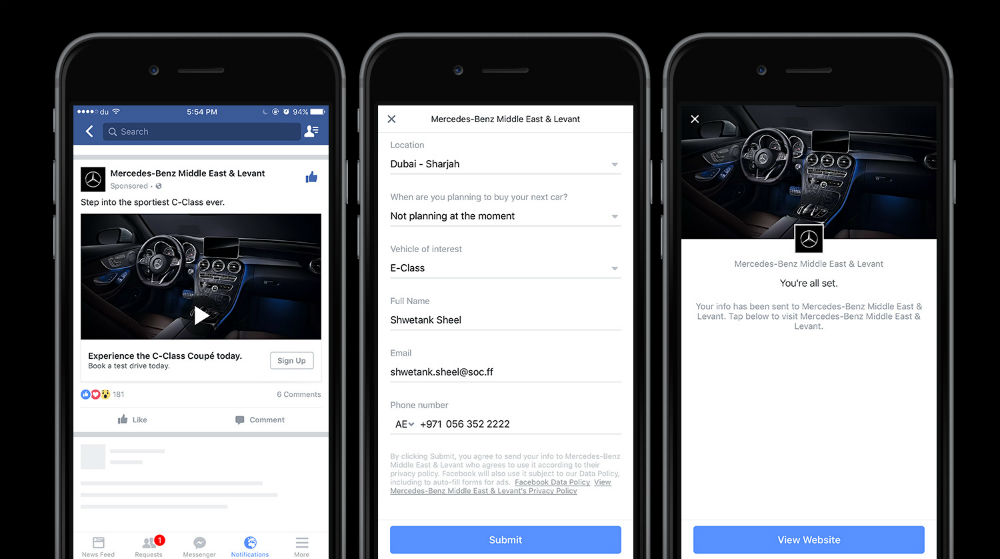 Laten we naar een praktisch voorbeeld kijken. Veel automerken zetten Facebook Ads in om nieuwe modellen onder de aandacht te brengen en vervolgens Facebook-gebruikers uit te nodigen om een testrit te boeken.