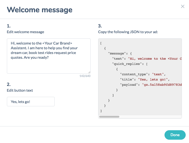 - Een JSON Structured Message voor mensen die klikken op de advertentie;