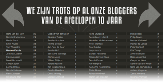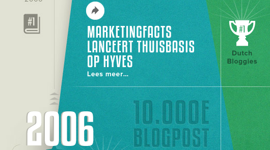 Inmiddels zijn we ruim 20.000 blogposts en 11.000 reacties verder, maar draait alles nog altijd om de community. We zijn er enorm trots op dat in al die jaren bijna 600 bloggers hebben bijgedragen aan het platform. Om hen en alle andere mensen die mee hebben geholpen aan Marketingfacts te bedanken, heeft Rodesk een kick-ass infographic gemaakt die de ontwikkelingen van de site, de hoogtepunten en bijzondere blogs van de afgelopen 10 jaar visualiseert. Als je ook een blog geschreven hebt voor Marketingfacts vind je je naam onderaan terug.