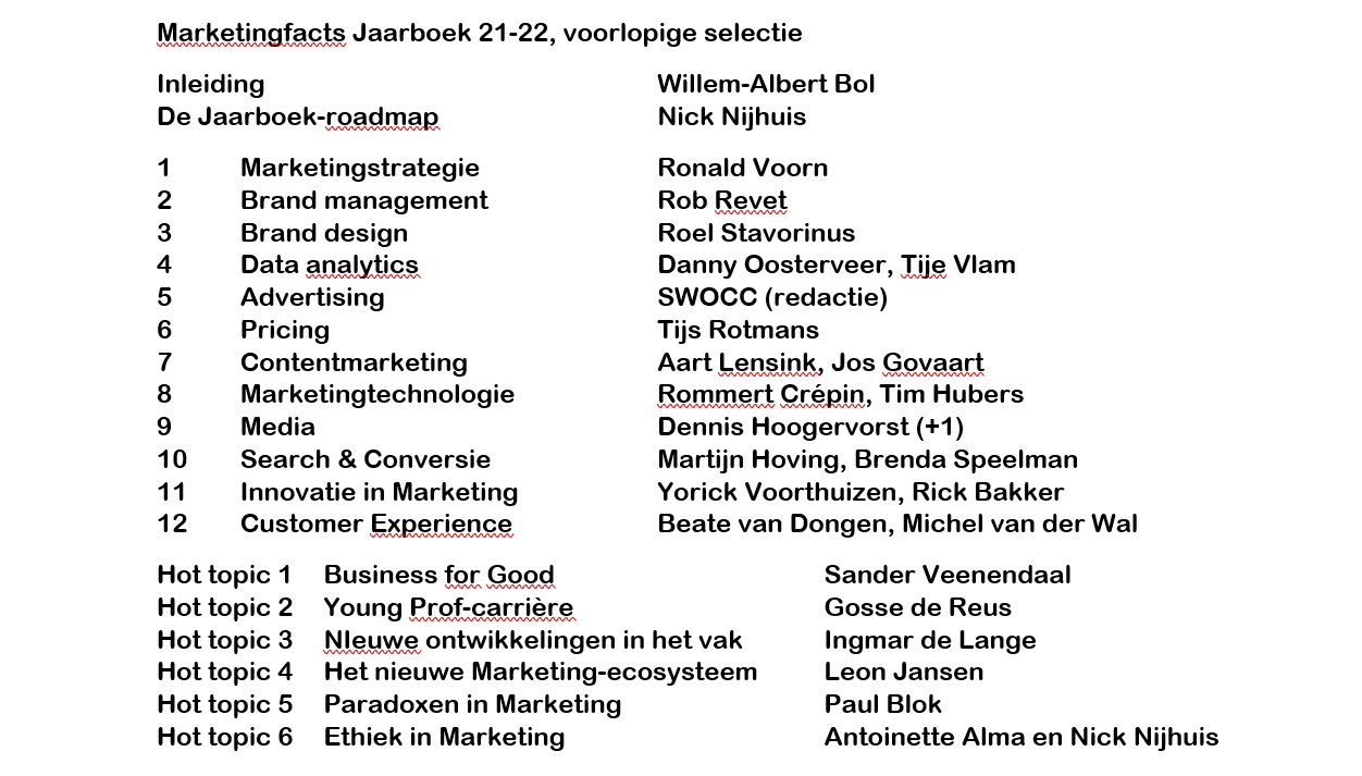 De opstelling van het nieuwe Marketingfacts Jaarboek is (bijna) rond en dat betekent dat een heel keurcorps aan vrijwillig meeschrijvende auteurs en hyperspecialisten momenteel noeste arbeid verricht om op de deadline te komen met een geheel nieuw of geheel vernieuwd hoofdstuk voor het Marketingfacts Jaarboek.