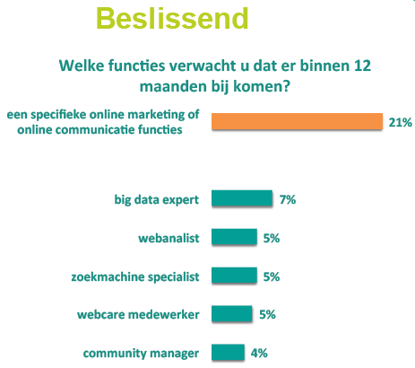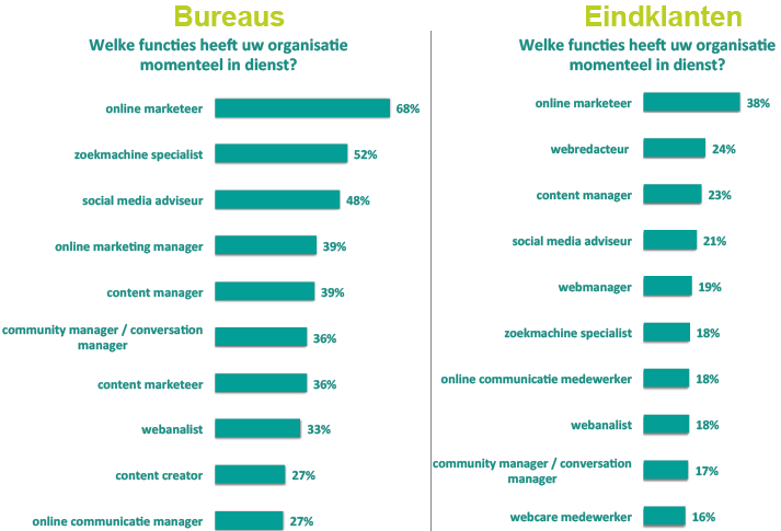 Uit het onderzoek blijkt dat van alle huidige online functies die van online marketeers het meest voorkomt, zowel bij eindklanten als bij bureaus. Bij bureaus zijn bovendien SEO- en ‘social’ functies goed vertegenwoordig, bij eindklanten in flink minder mate.