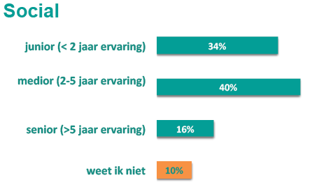 De ‘sociale’ functies betreffen vooral rollen op junior en medior niveau. Ondanks de directe klantrelatie heeft social het allerlaagste percentage senior functies van alle groepen. Klantgerichtheid (61 procent), creativiteit (36 procent) en schriftelijke communicatievaardigheden (31 procent) zijn de belangrijkste competenties voor ‘social’-functies.