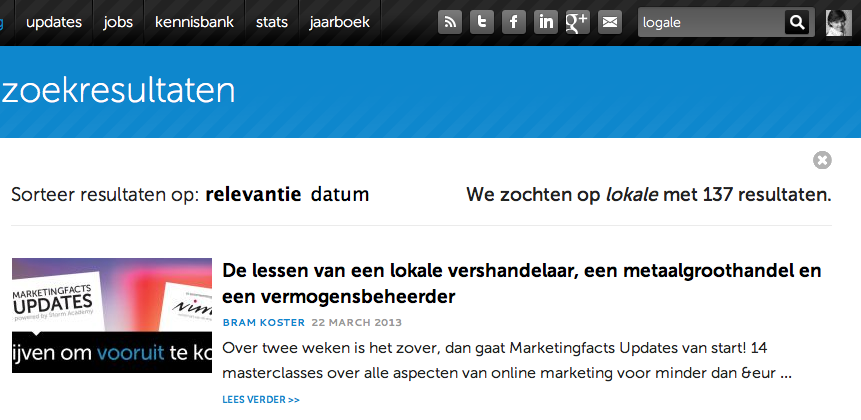 De interne zoekmachine is bij veel website een ondergeschoven kindje. Waarom? Moeilijk te zeggen. Wellicht ben je zo druk met het optimaliseren van de gebruiksvriendelijkheid van de interface en het aanbrengen van een logische structuur en navigatie dat je geen on-site search engine nodig denkt te hebben. In die val ben ik zelf ook gelopen. Goed dus dat Erik Keegstra van Sooqr me een tijd terug aan m’n jasje trok. Dat heeft er toe geleid dat we vandaag Sooqr als interne zoekmachine voor Marketingfacts hebben gelanceerd!