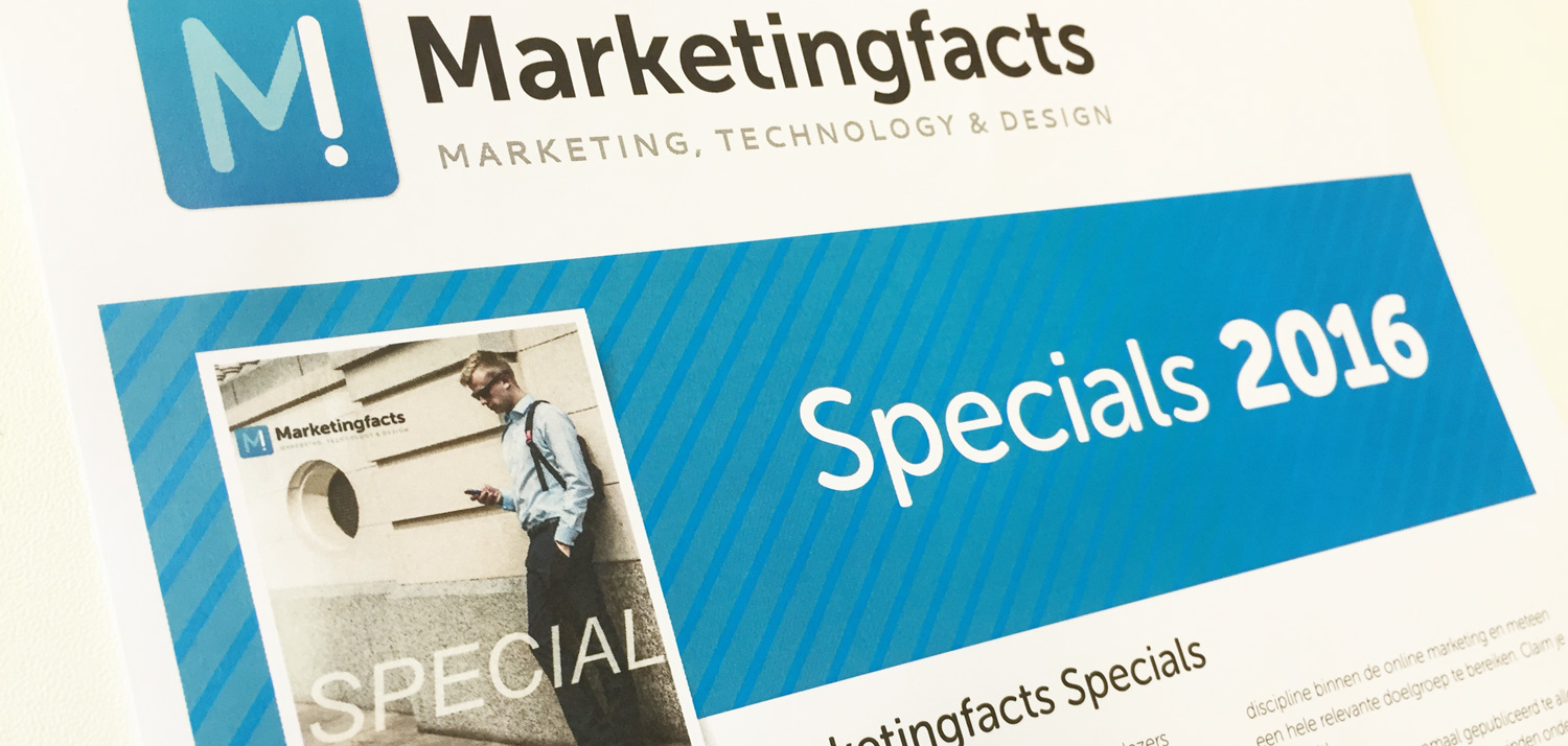 In 2016 starten we vanuit Marketingfacts met Specials, waarin we maandelijks een specifiek onderwerp meer nadruk geven, verder uitwerken, toelichten en analyseren. In januari richten we ons op marketing automation; een unieke mogelijkheid voor bedrijven op dat vakgebied om visie, projectaanpak en software onder de aandacht te brengen! In februari focussen we op Online Video en in maart nemen we de Toekomst van Transacties onder de loupe.