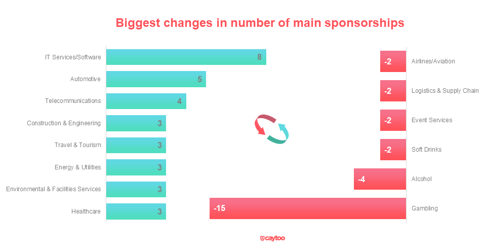 Door de pandemie is de wereld digitaler geworden. Daardoor is de dominantie van digitale bedrijven ook toegenomen en kiezen ook zij vaker voor het sponsoren van sport. Die ontwikkeling is ook terug te zien in de soorten hoofdsponsors. De sectoren IT Services-Software (plus 8 nieuwe sponsors), Automotive (plus 5, vooral door de toenemende populariteit van online retailers) en Telecom (plus 4) groeiden.