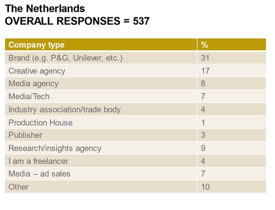 Redelijk stevige conclusies overigens om te extrapoleren op ‘de Nederlandse Marketingindustrie’. We vroegen het staatje op met de herkomst van de respondenten. Bijna 70 procent van hen werkt bij marketingdienstverleners (bureaus, media-exploitanten, onderzoekers, brancheclubs zelf). 166 Nederlanders, werkzaam in een bedrijf met een marketingfunctie reageerde dus. Er wordt geschat dat in Nederland ongeveer 250.000 mensen werkzaam zijn in een marketingbaan (van welke aard ook). Het is niet bekend in welke mate de resultaten voor beide bloedgroepen (bureau vs marketingorganisatie) verschillen. Gaan we nog achterheen.