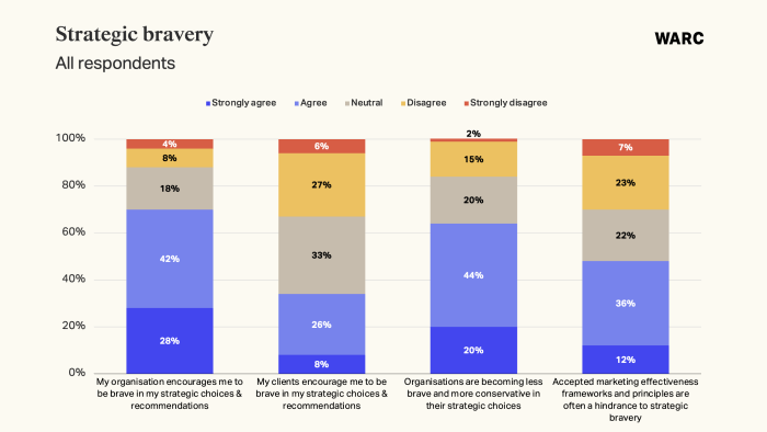 Maar.. slechts ‘70% of strategists are encouraged to be strategically brave, but just a third (34%) agree clients encourage brave decision making’, zegt WARC daarover. Kijk, zo vullen twee onderzoeken in één week elkaar mooi aan. Nog wat over het WARC-onderzoek, met wat quotes van WARC zelf bij de toelichting: