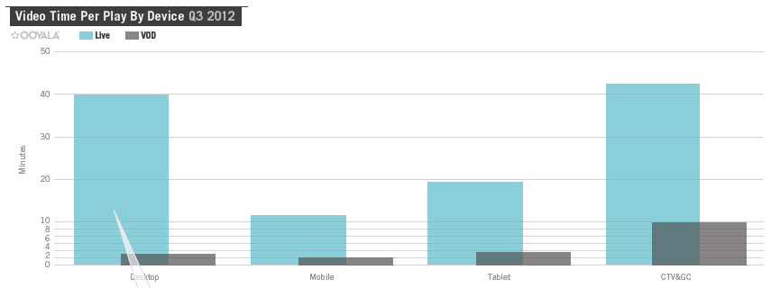 Het toenemend aanbod van live video lijkt de grote aandrijfkracht achter de toenemende videoconsumptie via connected devices, zoals duidelijk wordt uit volgende twee illustraties. De betrokkenheid van de kijker blijkt dan ook vele malen groter bij het kijken naar live evenementen dan naar video on demand.