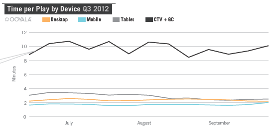 De term TV slaat tegenwoordig niet uitsluitend meer op de “buis” in de woonkamer, maar is in de laatste 2 jaar uitgegroeid tot een veel wijder begrip. Het staat nu in het kader van TV Everywhere en is synoniem voor videoconsumptie in het algemeen. De hedendaagse consument kijkt steeds vaker TV op een veelheid van andere apparaten dan het klassieke toestel, waarbij die non-traditionele sessies bovendien steeds langer duren, met als gevolg dat de tablet steeds meer als eerste scherm lijkt te worden gebruikt. Althans dat blijkt de conclusie van Ooyala in hun meest recente Global Video Index-rapport over het 3e kwartaal van 2012.