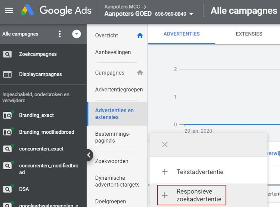 Afbeelding 1 & 2: het opzetten van responsieve zoekadvertenties in Google Ads