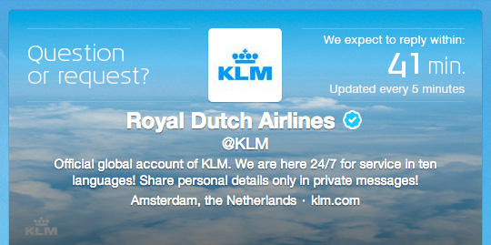 KLM heeft vorige week een nieuwe feature ‘soft‘ gelanceerd, de Social Service Monitor. KLM laat hiermee de actuele responstijden zien die gelden voor tweets die binnenkomen in de social media hub. Iedere vijf minuten wordt deze indicatie ververst op basis van alle social medis servicing-gegevens uit Salesforce. De informatie is nu beschikbaar op de Twitter-pagina van KLM en KLM.com en zal op termijn ook op Facebook beschikbaar zijn.