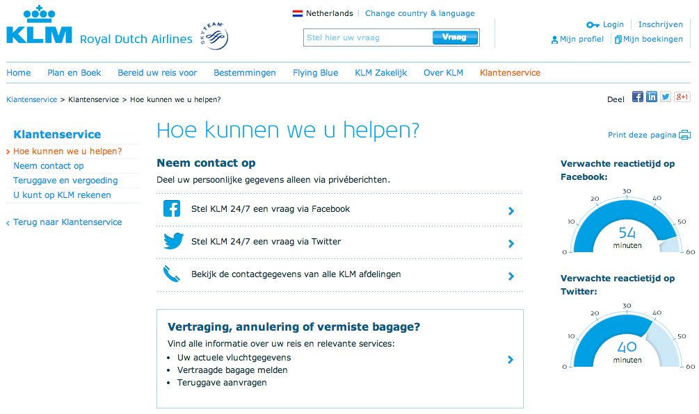 De indicatie van de social service-wachttijden op Twitter en Facebook zoals weergegeven op KLM.com