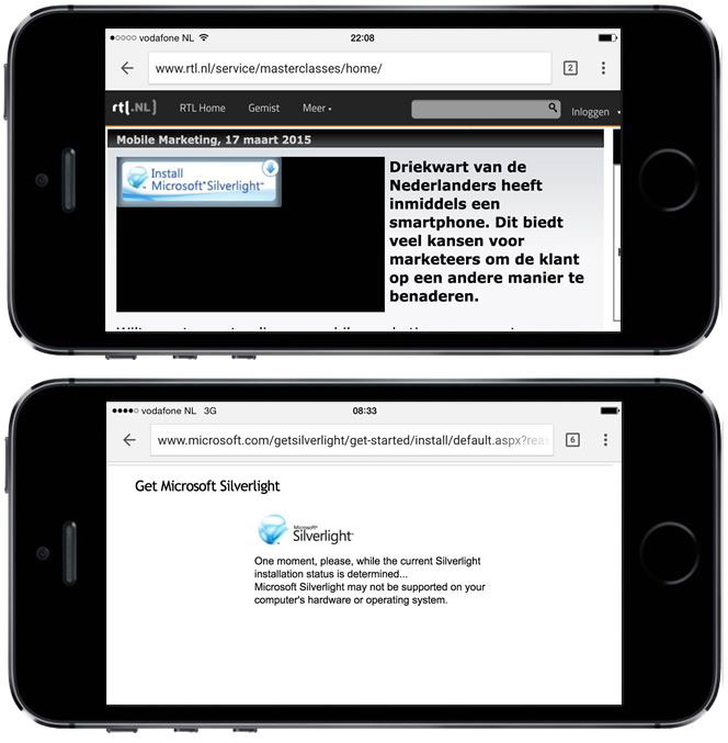 Maar goed, ik had (dacht ik) gevonden wat ik zocht, dus ik klikte. Ik werd opnieuw teleurgesteld. Ik kwam namelijk op een pagina terecht die niet was geoptimaliseerd voor mobiel en niet responsive was. Gelukkig stond er wel een video op de pagina. Een prima media formaat voor mobiel. Maar toen ik de video wilde gaan bekijken werd ik echt een beetje verdrietig. In plaats van een video die zich fullscreen opent op mijn iPhone, veranderde de tumbnail in een zwart vlak met de melding dat ik Microsoft Silverlight moest downloaden. Geen succes dus.