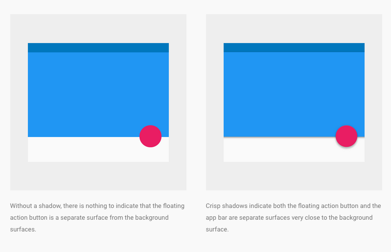 - De introductie van (design)fysica: een van de principes van material design is het nabootsen van de manier waarop de wereld waarin wij leven werkt op een simplistische manier. Dit kan worden gedaan door realisme slechts te gebruiken als een hulpmiddel om onze hersenen bekend te maken met de manier waarop een interface werkt. Google heeft dit gedaan door de Z-as toe te voegen. Flat design richt zich op het zo plat mogelijk weergeven van objecten, terwijl Google hier verandering in brengt door diepte te creëren door middel van onder andere intuïtieve animaties met diepte. Denk hierbij aan objecten die naar de voorgrond lijken te komen wanneer deze worden gesleept terwijl de rest vervaagt.