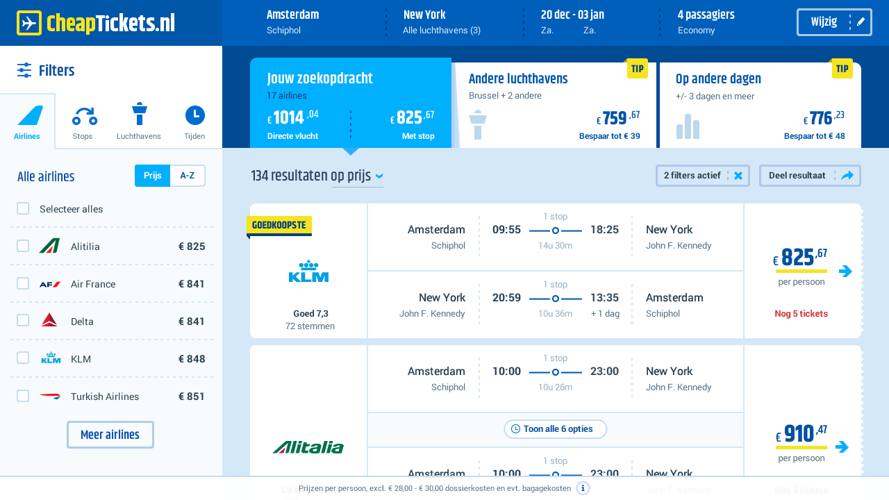 “Een integrale ervaring van zoekbox naar zoekresultaten, zowel op desktop als op kleine schermen. Wij hebben dit opgelost door met tabs te werken. Eentje met daarin de tickets op basis van de ingevoerde vertrek- en aankomstplek. Een tweede tab met hierin alternatieve luchthavens en een derde tab met resultaten voor dagen rondom de ingevulde vertrekdatum. Deze tabs bevatten dus bespaarsuggesties voor onze klanten. Dit soort resultaten werd voorheen niet of juist door elkaar heen getoond. Nu zie je in de tabbladen bovenaan de pagina in een oogopslag wat de goedkoopste optie is.”