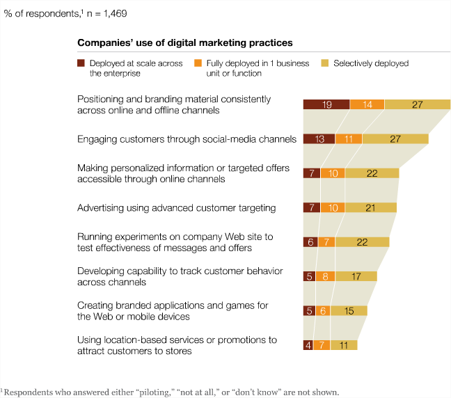 Volgens het McKinsey-onderzoek 'Minding your digital business', dat onder 1.469 C-level executives werd gehouden, zijn de drie belangrijkste trends in e-business: big data en analytics, digitale marketing & social media-tools en het gebruik van nieuwe platforms, zoals cloud computing en mobile. Deze drie trends vormen de strategische prioriteiten voor hun organisaties. In het onderzoek komt ook een aantal uitdagingen naar voren. Bijna de helft van de respondenten geeft aan dat de investeringen in digitale initiatieven die hun organisaties doen te klein zijn om hun doelen te bereiken.