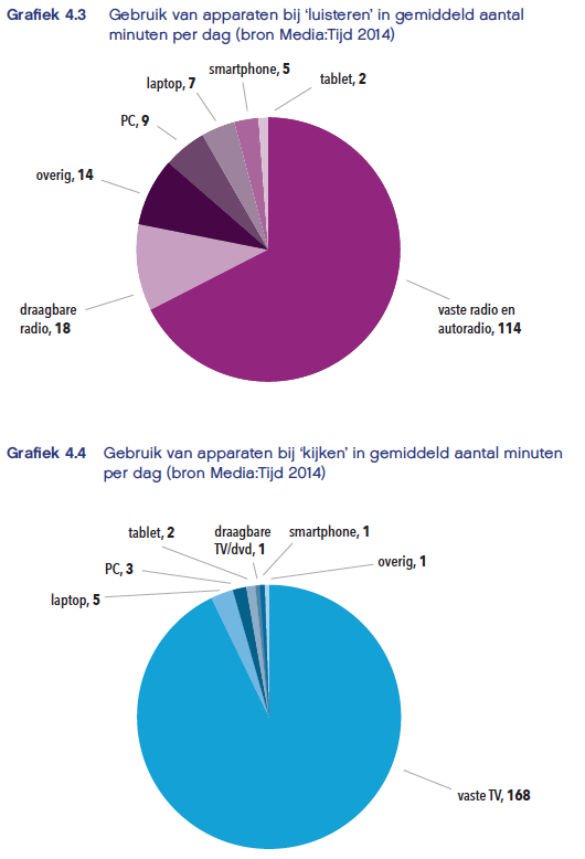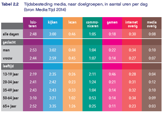 Media:Tijd is gebaseerd op 2.947 respondenten en is in het najaar van 2013 door onderzoeksbureau GfK uitgevoerd in opdracht van Nederlandse Publieke Omroep (NPO) en de media-onderzoeksorganisaties voor tv (Stichting Kijkonderzoek, SKO), radio (Nationaal Luisteronderzoek, NLO), print (Nationaal Onderzoek Multimedia, NOM) en online (Stichting Internetreclame, STIR). Het tijdbestedingsonderzoek is gedurende vijf weken uitgevoerd in de periode van 9 september t/m 13 oktober 2013. De populatie bestaat uit personen van 13 jaar en ouder in particuliere huishoudens in Nederland. Je kunt het rapport hier downloaden.
