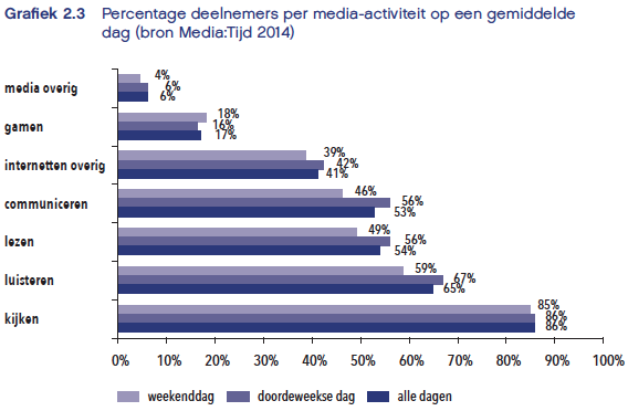 Interessant is het aantal deelnemers per medium. Als iemand minimaal 10 minuten heeft besteed aan een activiteit, dan telt hij of zij mee bij het percentage ‘deelnemers’. Op een gemiddelde dag heeft 86 procent van alle Nederlanders van 13 jaar of ouder minimaal 10 minuten tv-content gekeken, 65 procent heeft radio of muziek geluisterd, 54 procent heeft een printmedium gelezen (al dan niet digitaal) en 53 procent heeft via een elektronisch apparaat met anderen gecommuniceerd.