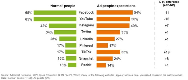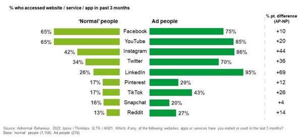 Eén van de leukste onderzoeken waarnaar ik verwijs tijdens de training is het ‘Adnormal’ onderzoek van Ipsos. Mensen die werken in marketingcommunicatie, in het onderzoek ‘ad people’ genoemd, hebben wezenlijk ander mediagedrag dan het gewone publiek. Zoals je hieronder kan zien worden nieuwere media door ad people frequenter gebruikt dan door het gewone publiek en sowieso gebruiken ze meer verschillende kanalen.